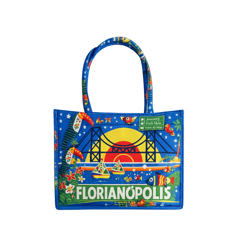 A Bolsa Florianópolis destaca a beleza da ilha com uma estampa colorida e cheia de vida, inspirada em pontos turísticos e no clima praiano da cidade. O design alegre transmite o espírito leve do litoral catarinense, tornando a bolsa um acessório cheio de personalidade.