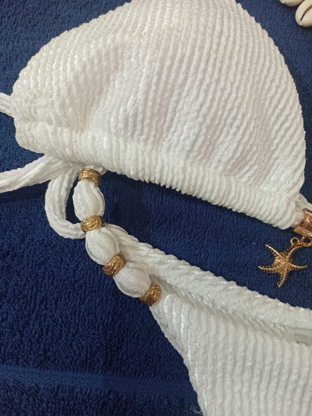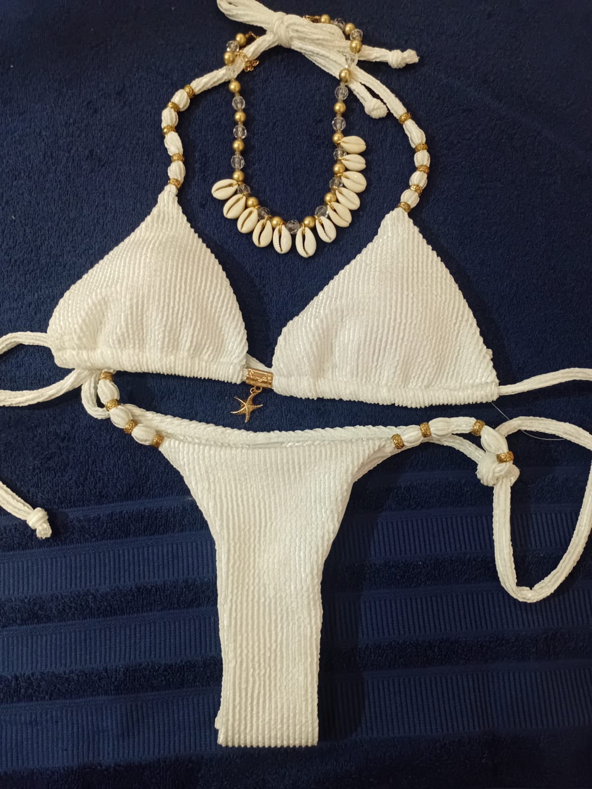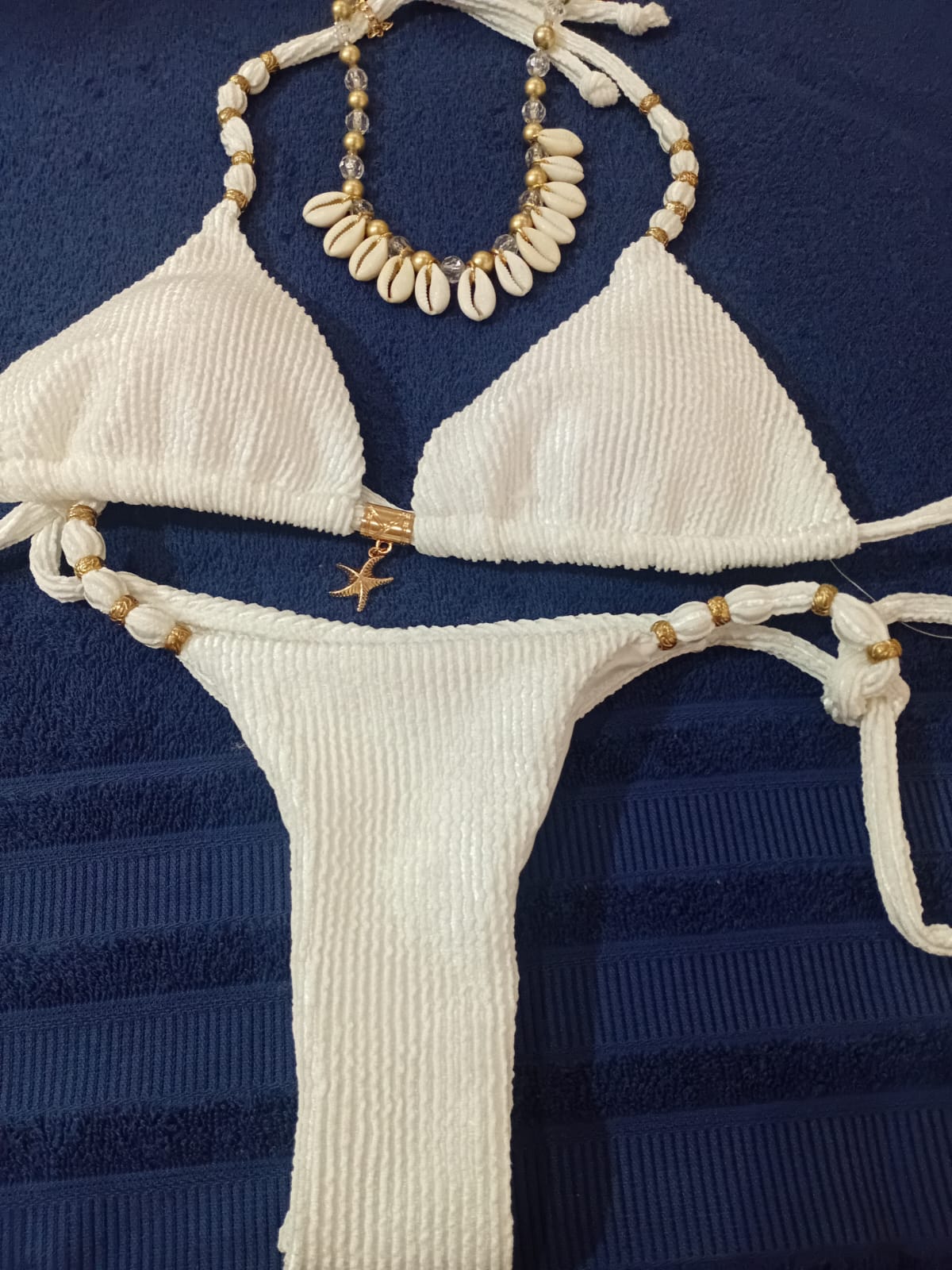 Biquíni Cortininha + Calcinha de Amarrar Detalhes em conchas Cor: Azul Tamanho: GG