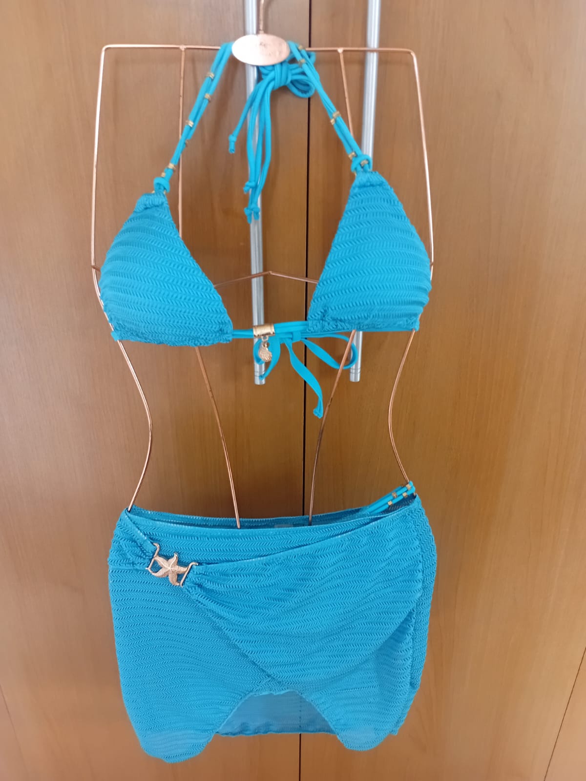 Biquini cortinha e Calcinha Fio Dental + Saída Curta Cor: Azul pérolado Tamanho: G
